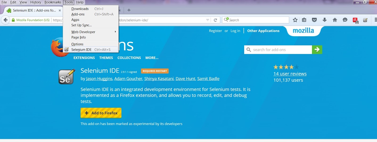 2.) After the installation process, check 'tools' menu: Selenium IDE field will appear.