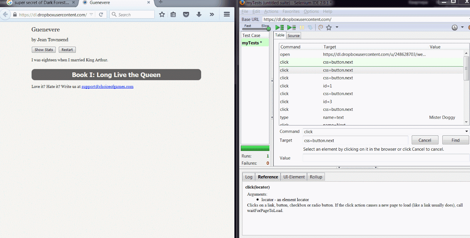 How to achieve that? I'll show you how to create your automated tests for web-based interactive fiction and text adventures using special set of tools - Seleninum. I will cover the simplest way of writing tests with the help of Selenium plugin for Firefox. You can achieve the same effect using standalone version of Selenium toolset, but it won't be that easy.